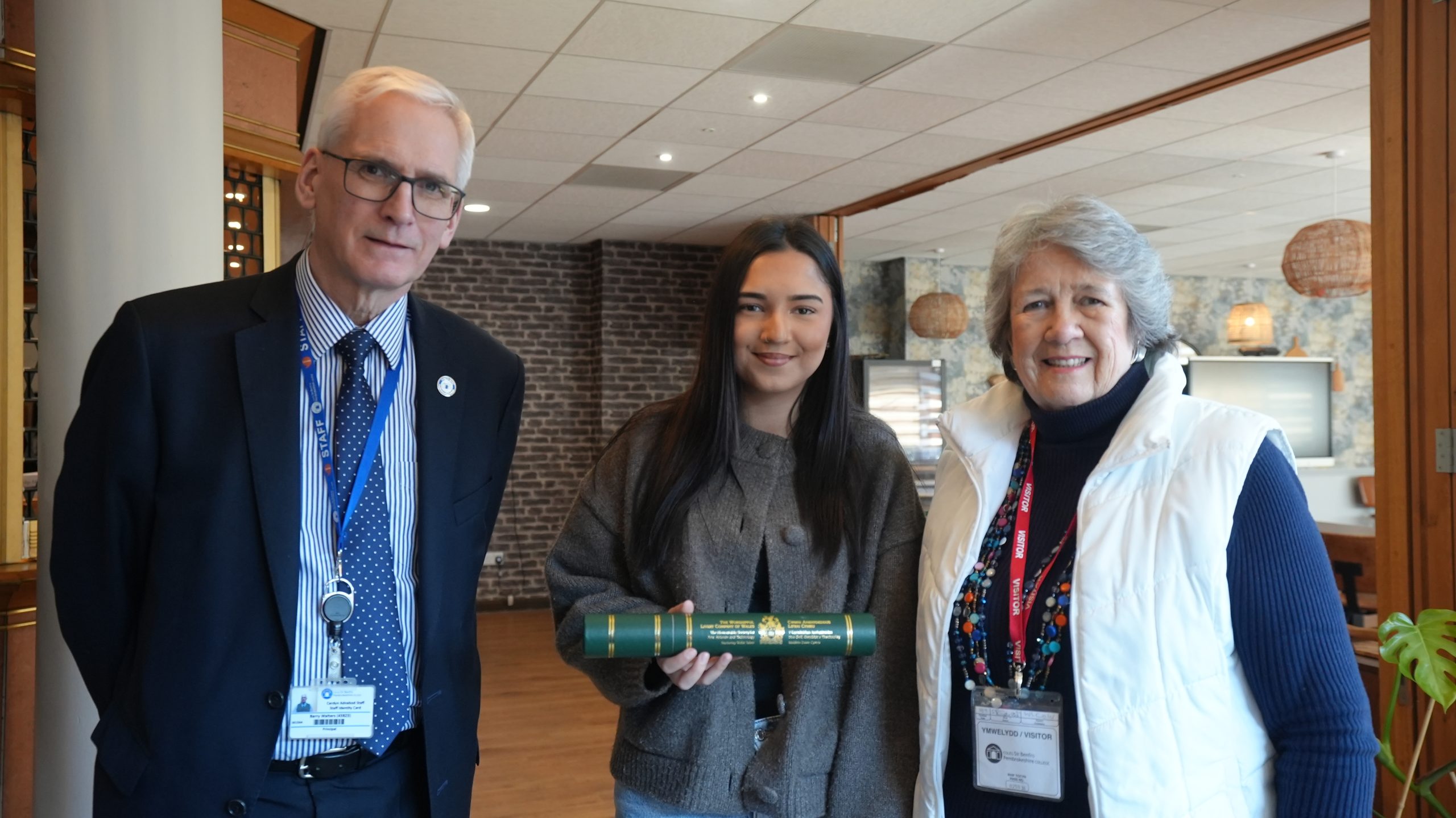 Picture: Learner Eleanor Edwards with Sylvia Robert-Sargeant and Pembrokeshire College Principal Dr Barry Walters.