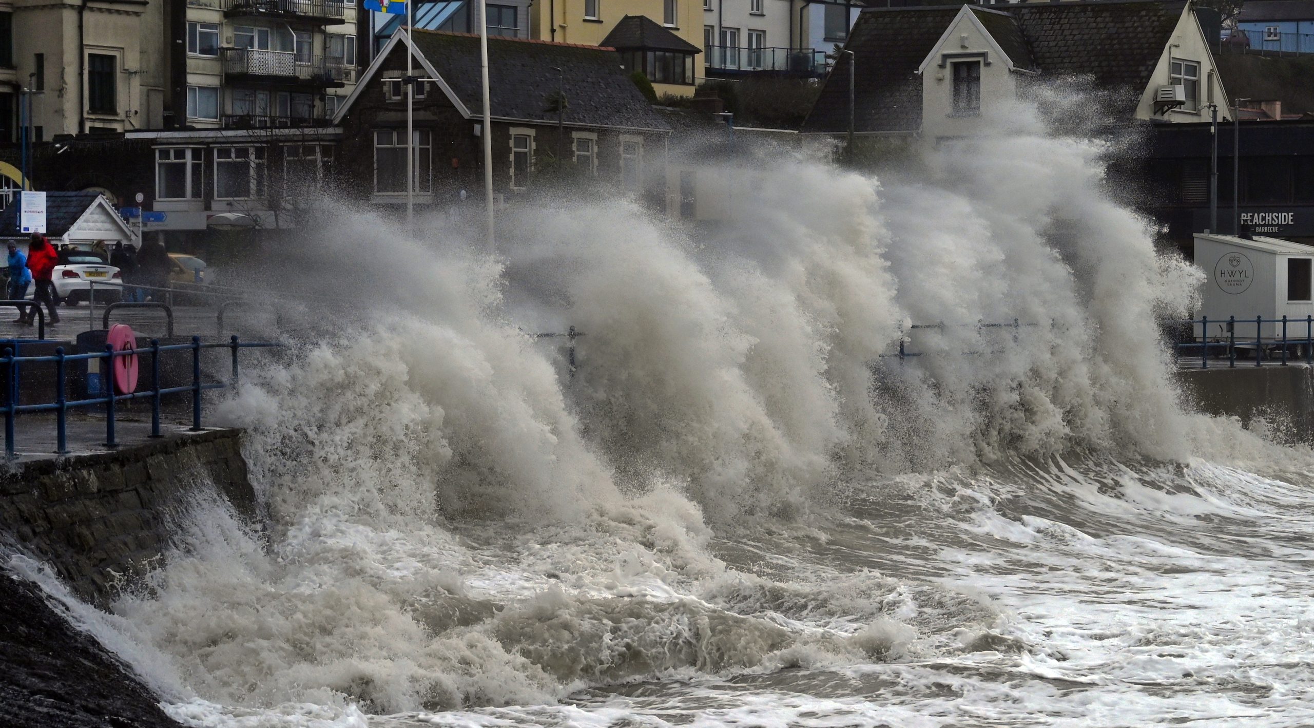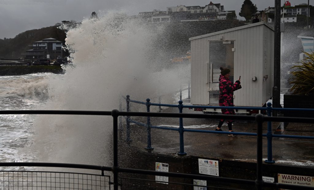 Along the coast, conditions were dramatic through the morning, with huge waves crashing into Saundersfoot Harbour as the storm pushed in, bringing rough seas and spray over exposed areas.