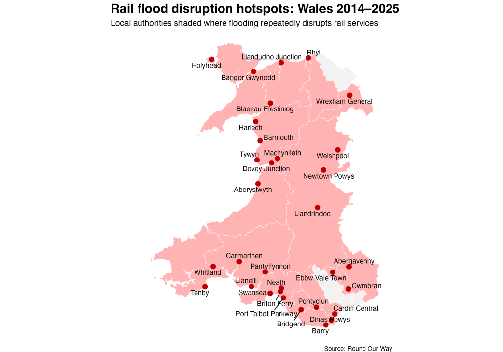 Round Our Way said its analysis of Network Rail cancellation data suggests flood-related disruption is placing increasing strain on the rail network as periods of extreme rainfall become more common.