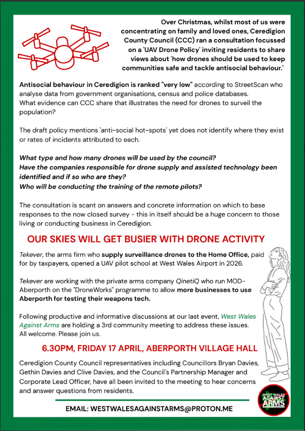 WEST WALES AGAINST ARMS will hold a third community meeting in Aberporth this Friday as campaigners step up concerns over proposed drone surveillance in Ceredigion and the growing role of private arms companies in the area.