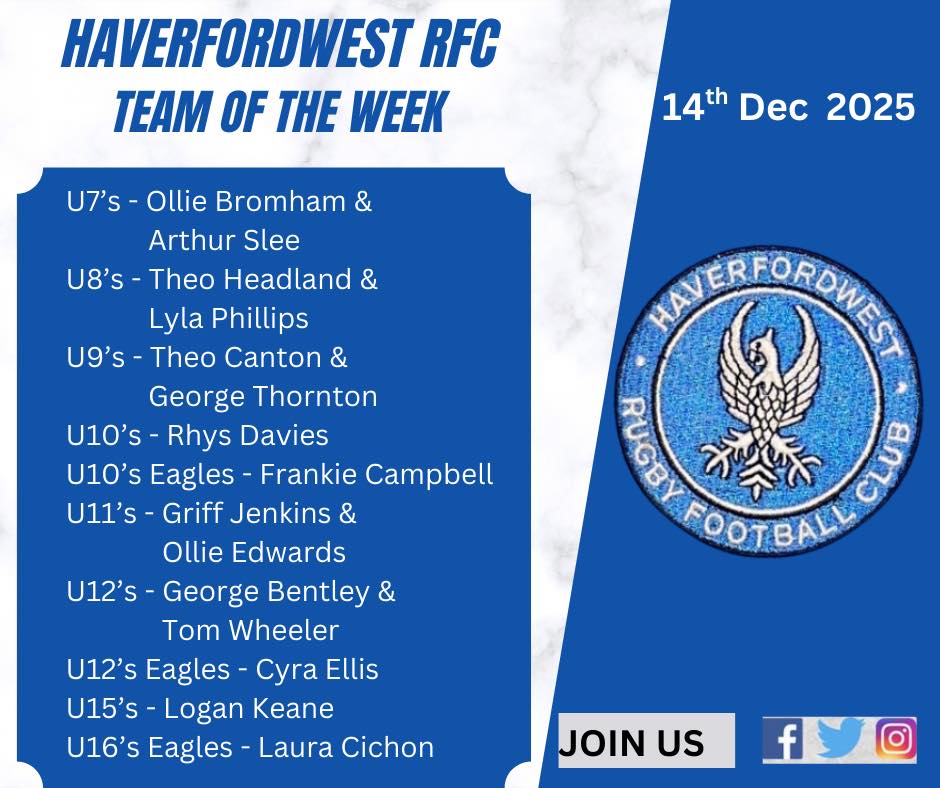 HAVERFORDWEST Rugby Football Club has announced its latest Team of the Week, celebrating standout performers from across the junior age groups following another busy weekend of fixtures.