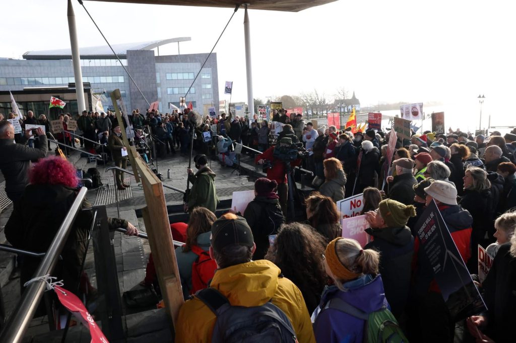 A PROTEST took place outside Senedd Cymru on Wednesday (Feb 11) as campaigners gathered to oppose large-scale wind farms, energy parks and new overhead pylons across rural Wales.