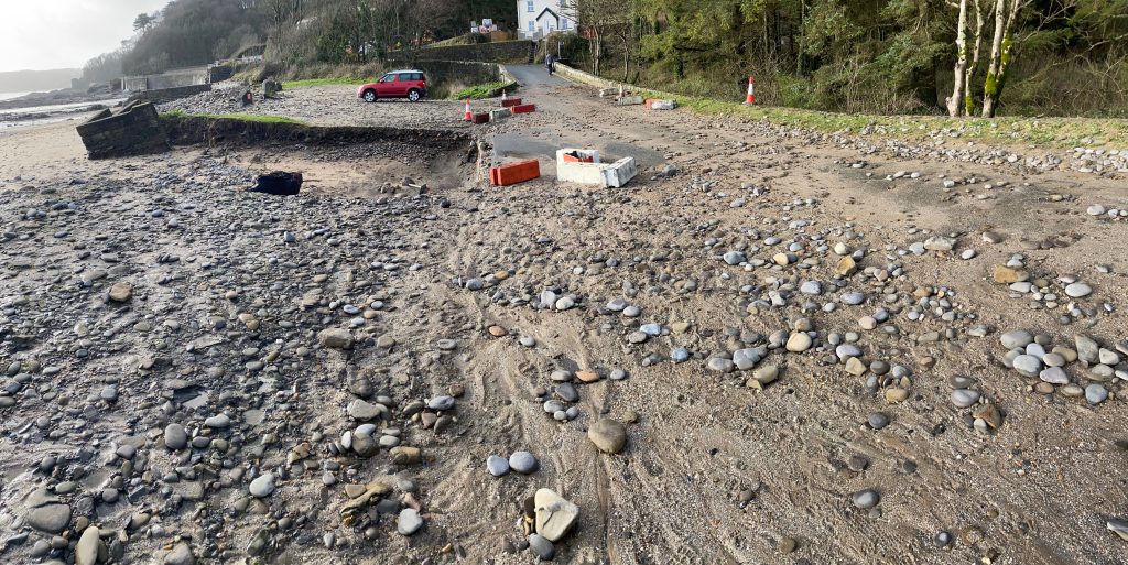 Machinery was deployed early today to remove pebbles thrown up by large waves, allowing the main coast road to reopen. Teams have now moved on to Welsh Road, Newgale, where further deposits are being cleared.