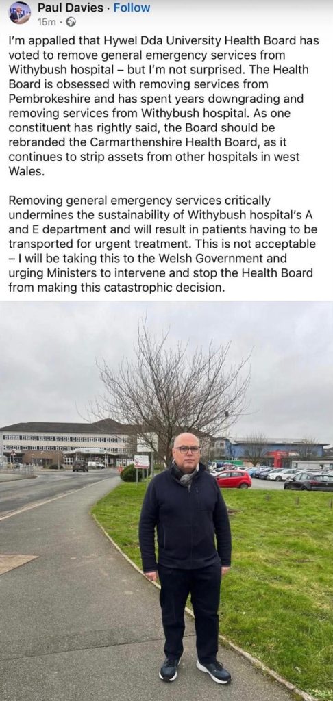 In a social media post earlier this week, Mr Davies said he was “appalled” that the Health Board had voted to remove what he described as “general emergency services” from Withybush, warning that the decision would undermine the sustainability of the hospital’s A&E department and force patients to travel further for urgent treatment.