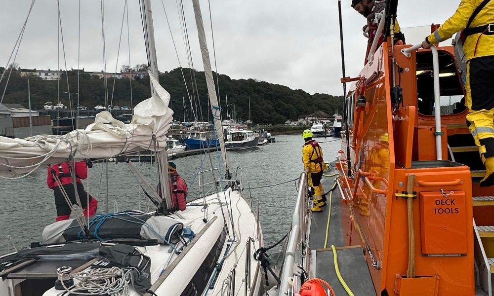ST DAVIDS RNLI was requested to assist a 40ft yacht suffering engine failure and becalmed through lack of wind in the middle of St Brides Bay...