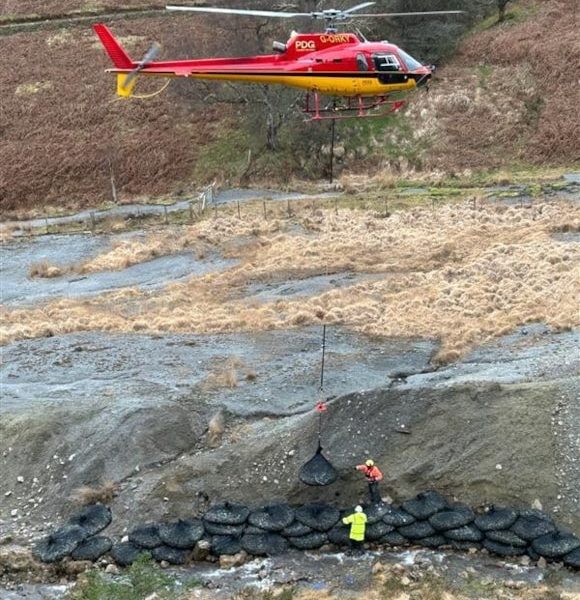 A HELICOPTER was used to fly in materials to a former lead mine in Carmarthenshire as part of urgent work to stop polluted mining waste being...